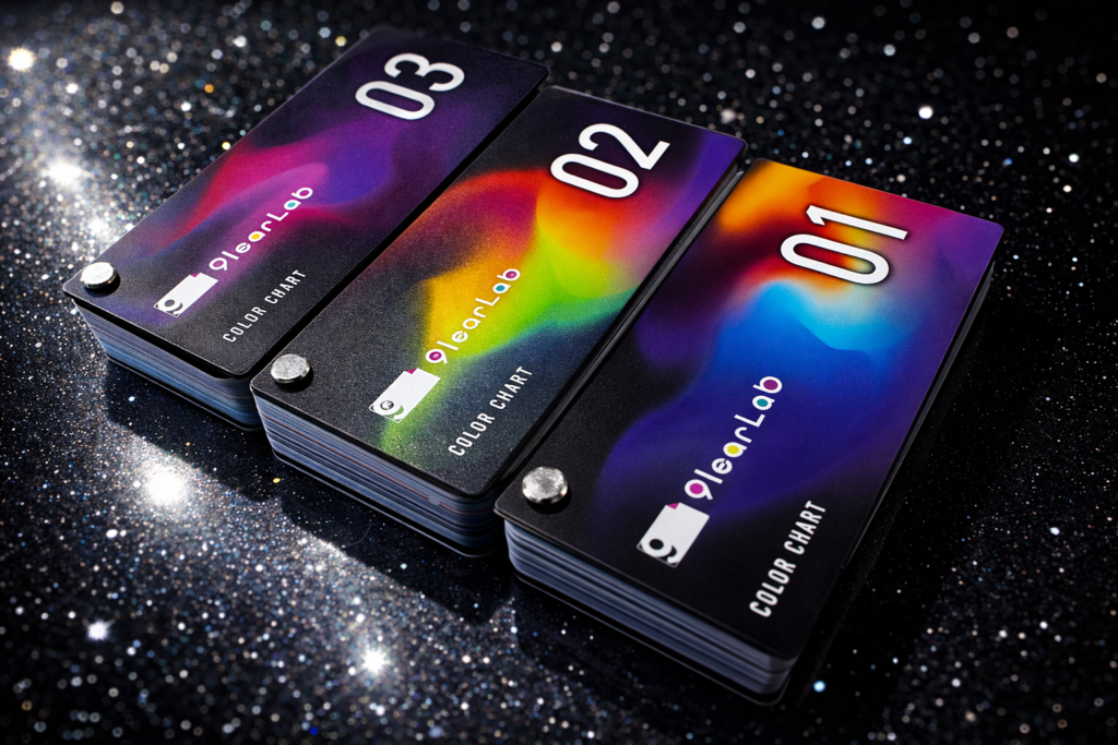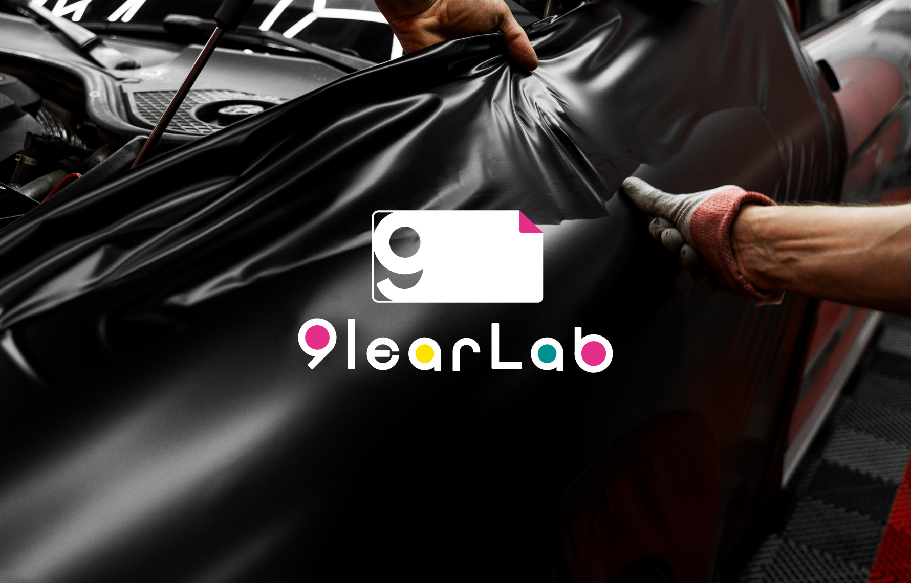 9learLabのロゴは、“究極”を象徴する数字「9」をベースに、ブランドの哲学と職人の技術を象徴的に表現しています。力強い「9」は、限界を超える挑戦心と、最高品質を追求する姿勢を示しています。右上の折り返しは、フィルムを貼り込む最後の一手を表現し、当たり前を塗り替えたイメージしてます。3色の円(ピンク・イエロー・グリーン)は、800色以上におよぶフィルムバリエーションと、表現の無限の可能性を象徴。