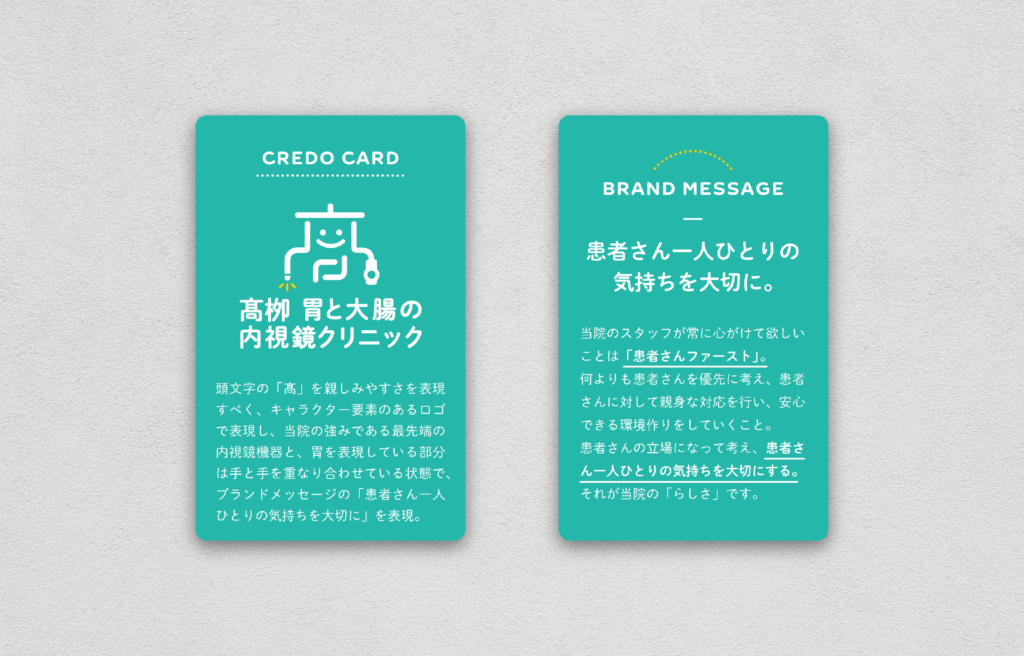 このロゴを軸に、診察券、クレドカード、パンフレットなどの各種ツールへ展開し、一貫したブランドイメージを構築しています。