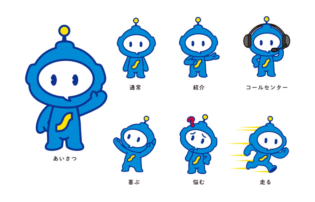 最大の特徴は、「吹き出し」の形を模した顔の輪郭。これにより、感情や言葉を交わす「コミュニケーションの顔」であることを直感的に伝えています。青を基調としたカラーリングでIT企業らしい信頼感や清潔感を保ちつつ、胸元にはワンポイントのロゴマークを配置し、視認性とポップさを高めました。